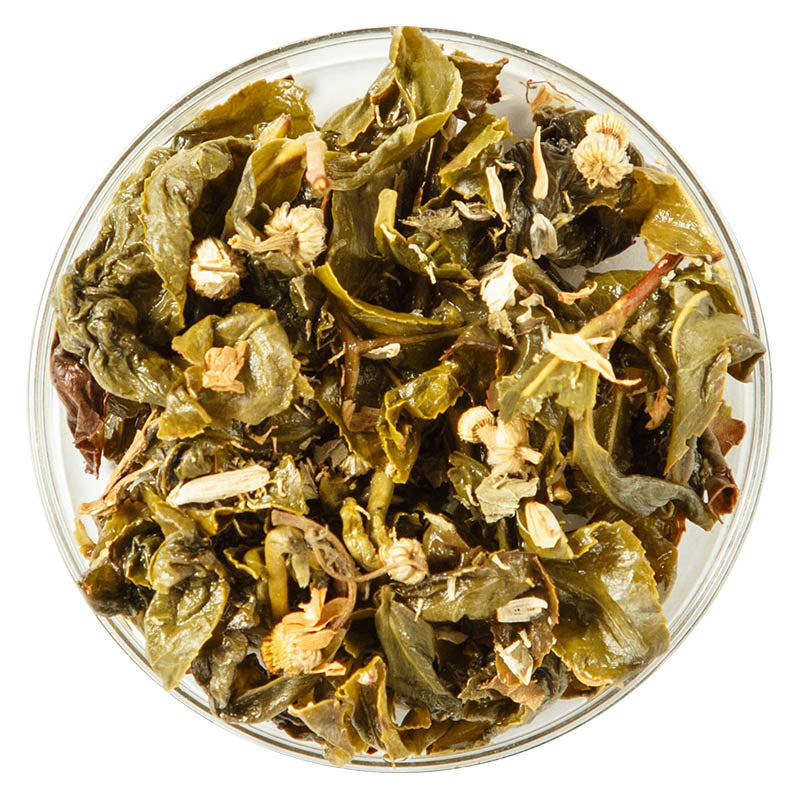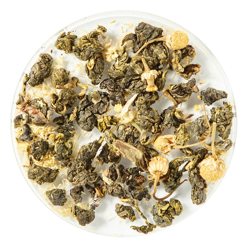 Our floral oolong blends are specially formulated to harmoniosly bring together the distinctive aromas and flavors of our premium teas with all the added health benefits of herbs. The sedative, calming effects of chamomile make it a classic addition to any blend—our first choice after a productive day at the office!