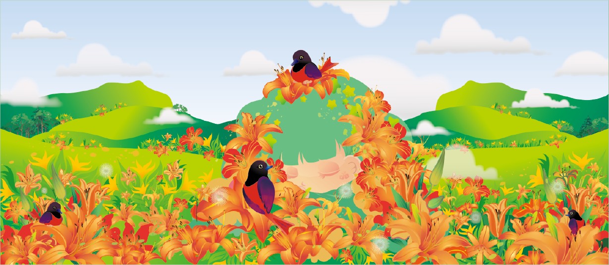In the painting, a blossoming sea of golden needle flowers adorns the green mountain, creating a radiant golden carpet that covers every corner of Liushishi Mountain. Hidden within the flower sea is a sleeping girl, surrounded by sunbirds (Taiwanese endemic subspecies and birds of Hualien County), gently lulling her into a slow pace, allowing herself to wander in the warm and sunny flower sea.